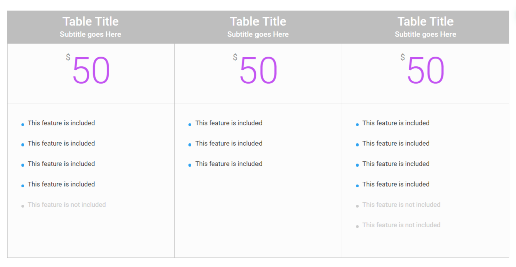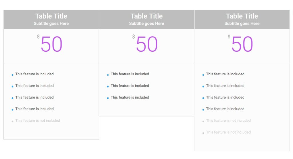 When using the pricing tables module you will see that the height of each table is going to rely on the content you put there, so if you have different content in each table, you will see something like this: